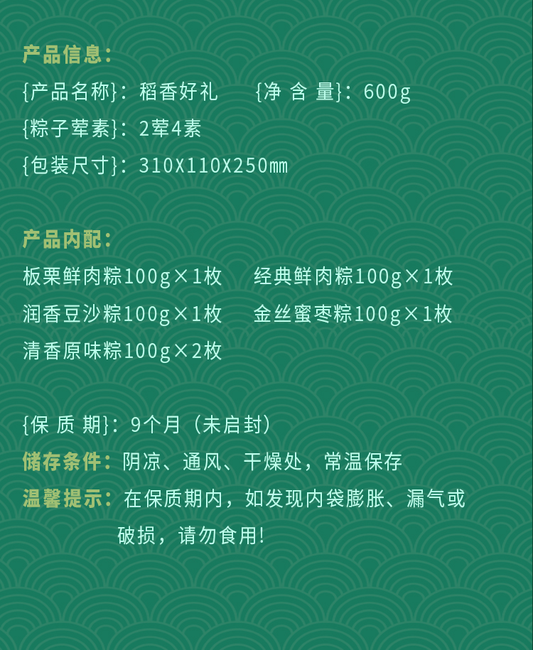 内含口味:干贝鲜肉粽 100gx2枚 藜麦肉粽 100gx1枚火腿肉粽 100gx1枚蛋黄鲜肉粽 100gx1枚板栗鲜肉粽 100gx1枚咸鸭蛋 60gx8枚原味小桃酥120g(8片)奶油曲奇54g(4片)峨眉雪芽绿茶 4gx4罐 豌豆腊肉粽 100gx1枚 经典鲜肉粽 100gX2枚 红烧排骨粽 100gx1枚 桂花蜜藕粽 100gx2枚山楂锅盔 180g(6片)椒盐小桃酥120g(8片)巧克力曲奇54g