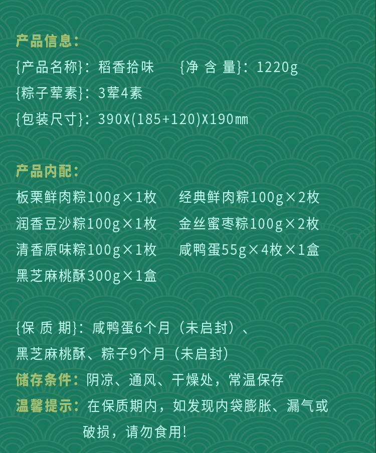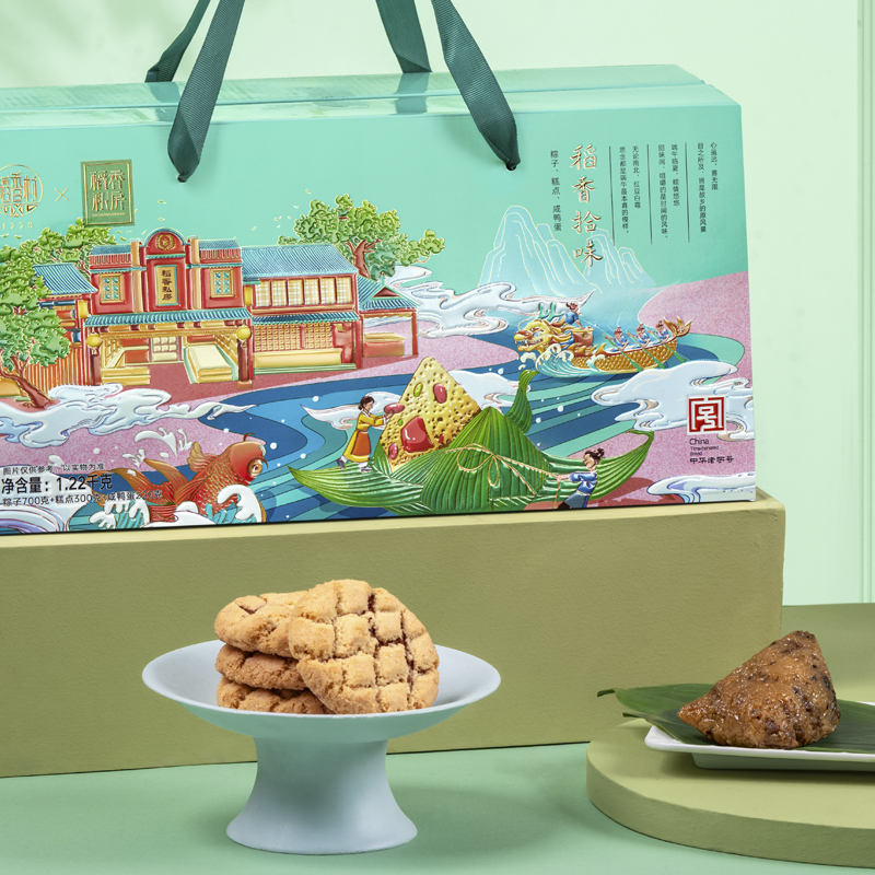 内含口味:板栗鲜肉粽100gx1枚经典鲜肉粽100gx2枚金丝蜜枣粽100gx2枚润香豆沙粽100gx1枚清香原味粽100gx1枚咸鸭蛋55gx4枚x1盒黑芝麻桃酥300gx1盒